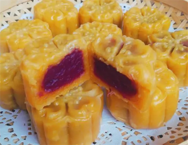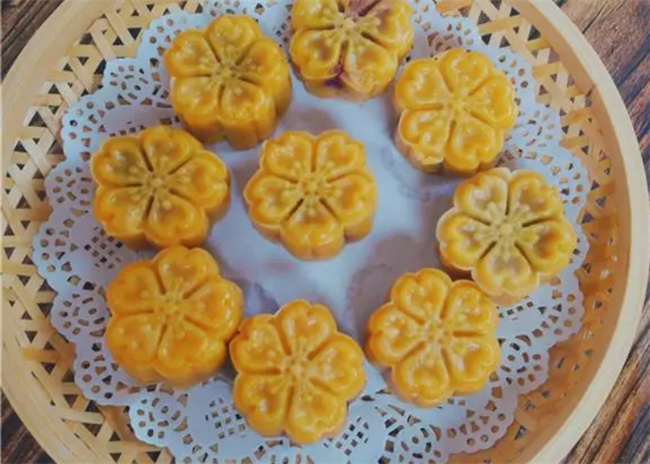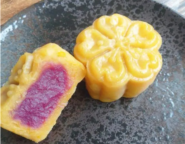 二、南瓜紫薯餅的制作 1、食材 南瓜200g、紫薯100g、糯米粉100g 50g、面粉50g,牛奶10g 2、制作步驟: 將洗凈去皮的南瓜和紫薯切片,上鍋蒸熟,大約20分鐘,用筷子能輕松扎透即可。用搟面杖將南瓜和紫薯搗成泥狀。將南瓜泥、紫薯泥與糯米粉、面粉混合,逐漸加入牛奶揉成面團。分別將面團和紫薯泥團分成小劑子,揉成小球狀。將南瓜面團壓扁,搟成薄餅,將紫薯泥包入南瓜面團,揉成光滑的餅胚。將餅胚放入月餅?zāi)>咧校瑝褐瞥尚汀@渌襄仯蠡鹫?0分鐘,待涼即可。
