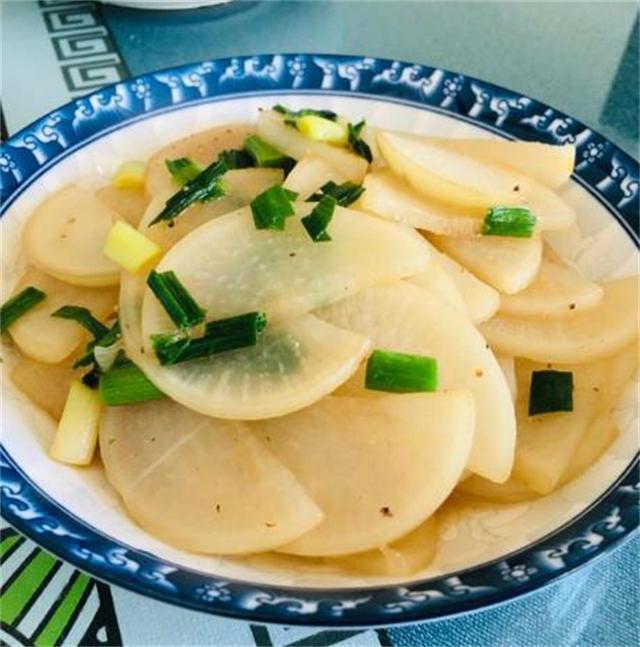 炒至白蘿卜片變得透明、顏色鮮艷時,就可以出鍋了。最后,在盤子上撒上一些蔥花和芝麻,就可以享用了。