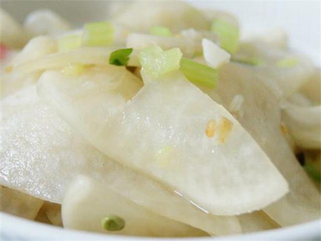 首先,選擇一個新鮮、脆嫩的白蘿卜。把白蘿卜的皮刮掉,切成薄片。然后,把這些薄片放入一個碗中,加入適量的鹽和糖,腌制10-15分鐘。