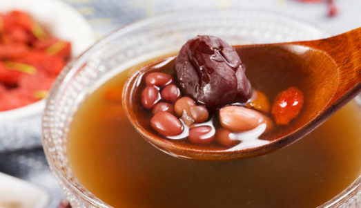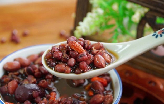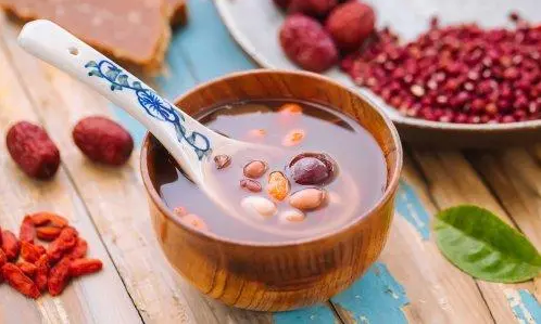 五紅湯的做法食材:紅棗、赤小豆、紅皮花生各50g,枸杞子10g,紅糖適量。 做法:將赤小豆提前一晚浸泡,花生提前2小時浸泡。鍋中加入紅棗、赤小豆、花生、清水一起煮開轉小火煮40分鐘,出鍋前加入枸杞和紅糖。 作用:益氣補血、滋補肝腎、利水消腫。 |