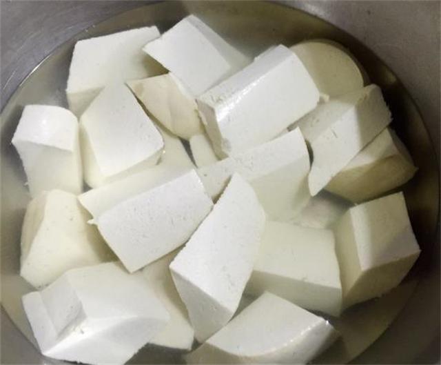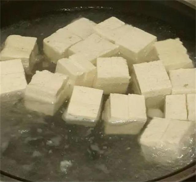 接下來,將豆腐切成均勻的小塊,然后放入鍋中加水,加鹽。鹽可以提高豆腐的滲透壓,使其更加入味。然后,將火調小,用慢火煮豆腐。