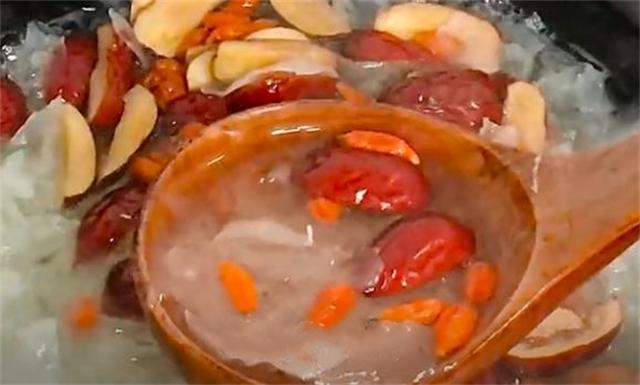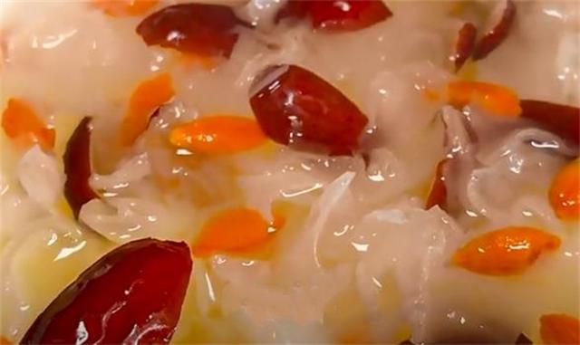 7.接著再加入適量的冰糖,然后開小火慢燉20分鐘,慢燉的時候,中間我們也要用筷子不停的攪拌,這樣有助于快速出膠,湯汁也會變得越來越濃稠。等到熬制10分鐘的時候,我們再往里面加入適量的枸杞和紅棗,因為枸杞和紅棗都含有肌酸,放早了會影響出膠率。還有一句俗話說的好,想要甜放點鹽,大家也可以在出鍋之前放一點點鹽,這樣能夠更加突出銀耳羹的甜。最后一個重點就是煮銀耳湯中間最好不要加水,如果是因為你的砂鍋太小,最好也要加熱水,千萬不要加涼水,因為加涼水會導(dǎo)致水溫下降,從而銀耳的細胞壁收緊,也會影響出膠率,降低食用口感。
