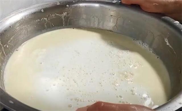 8.過濾好后將豆漿倒入大盆中,重復這個操作3到5次,我這里一共洗了三次,在煮豆漿的過程中需要多攪拌一下,防止糊底。