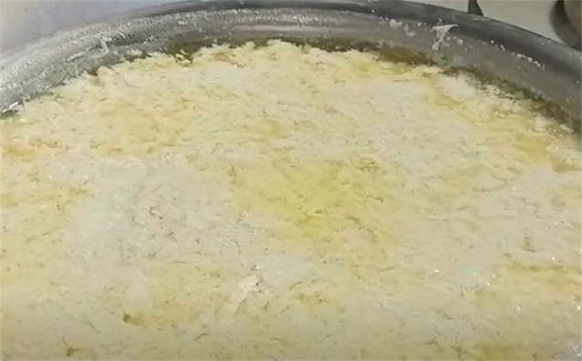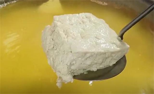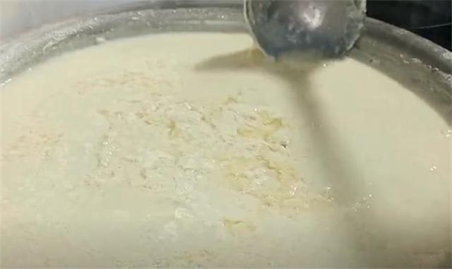 16.找一個有孔的東西放上來,然后將舀出來的水倒回去,這樣操作主要是防止將豆花沖散。