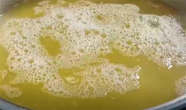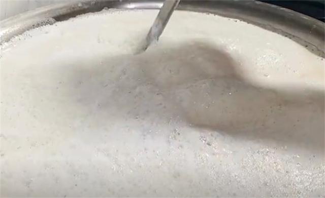 11.這個時候豆花還沒有形成,我們可以把上層的氣泡去掉,這樣做出來的豆花更有食欲。1分鐘后繼續倒入稀釋過的白醋,每過1分鐘重復這個操作,大約需要3到5次,這是第三次。看已經有很多豆花出現了。
