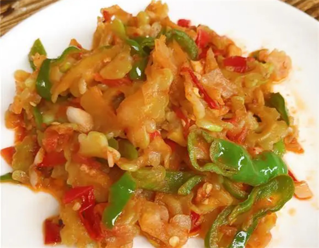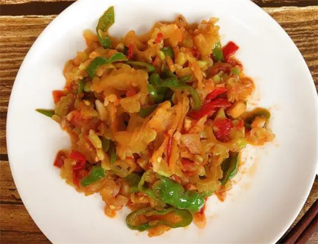 【青椒炒苦瓜】 一、食材: 苦瓜1根、青椒80克、西紅柿80克、大蒜15克 二、制作步驟: 1. 將苦瓜洗凈,去頭去尾,將其切成兩半,然后去除瓜瓤。 2. 將苦瓜切成薄片,撒上適量鹽,用手抓拌均勻,然后靜置20分鐘,去除苦味,最后用清水沖洗干凈。 3. 將青椒洗凈,切成片狀;將西紅柿洗凈,切成塊狀;將大蒜去皮,洗凈后切成片狀。 4. 熱鍋加熱,放入適量食用油,燒熱后加入西紅柿,爆炒至西紅柿皮皺縮,汁液溢出。 5. 加入青椒和大蒜,一同翻炒2分鐘。 6. 接著加入苦瓜,繼續翻炒2分鐘,加入適量鹽和生抽調味,攪拌均勻即可。