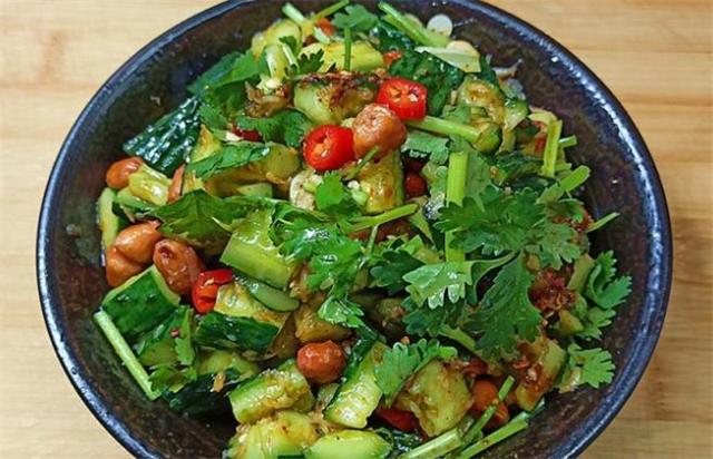 接下來是秘制調料的關鍵時刻!將炸好的花生米搗碎,加入適量的鹽和糖,攪拌均勻后,撒在黃瓜上,再撒上一些香菜末,最后將調好的料汁澆在黃瓜上,翻拌均勻即可。