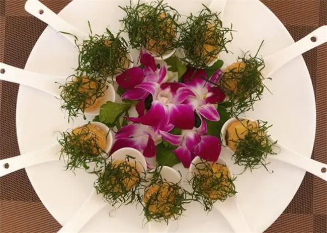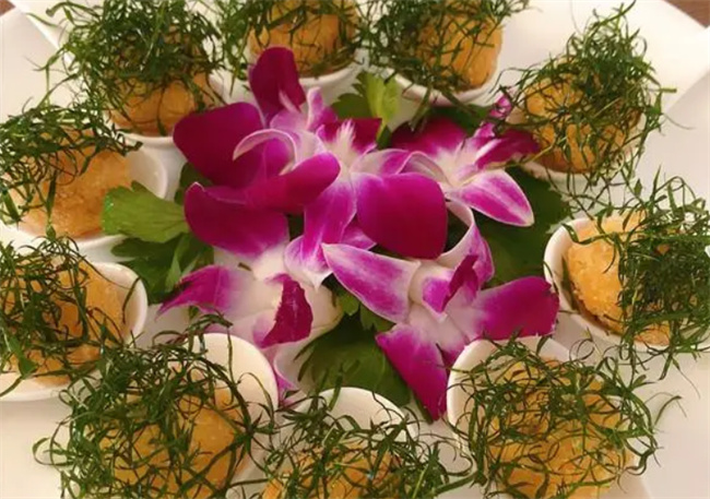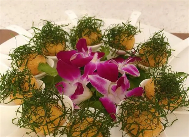 一、制作花團錦簇香酥肉丸的步驟: 1. 將肉丸從冷凍中取出,放在盤中解凍。 2. 準備一個大白瓷盤,將十把瓷勺擺成圓形,中間擺上漂亮的蘭花。如果沒有蘭花,可以用其他花朵代替。 3. 打發兩個雞蛋,將解凍好的肉丸放入蛋液中裹上,再裹上面包糠。 4. 將橘子葉洗凈,切成細絲。 5. 加熱一些油,將橘子葉絲放入鍋中炸約15秒鐘,直至葉絲卷曲,變得酥香,然后將其放在一邊備用。 6. 將裹好面包糠的肉丸放入熱油中炸約3分鐘,直至表面金黃酥脆。 7.將炸好的肉丸放入準備好的大白瓷盤中,再將橘葉絲輕輕地擺在肉丸上。