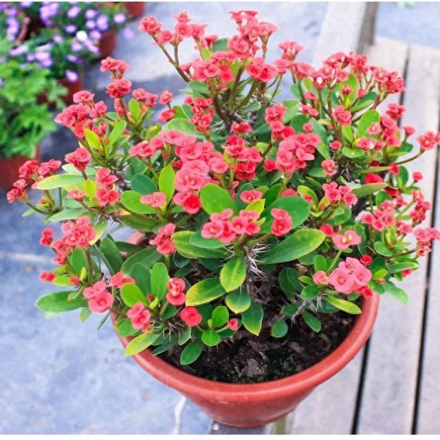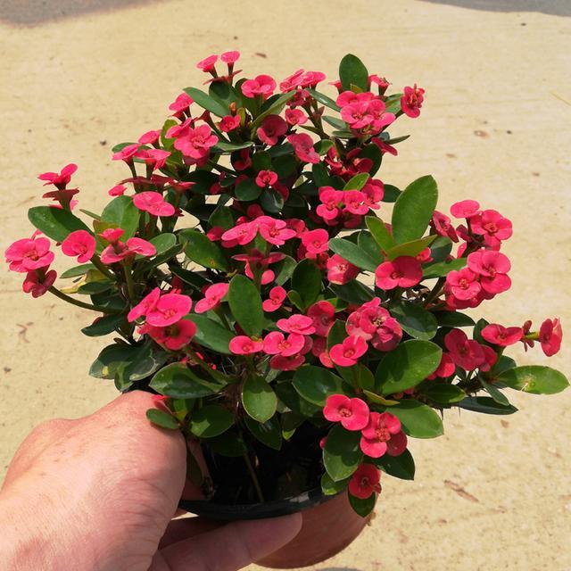 4、虎刺梅 虎刺梅是一種“開花機器”,一年四季都可以開出各種各樣的花,只要氣溫不超過5攝氏度,就可以一直開下去, 而且養(yǎng)護(hù)起來也很容易,養(yǎng)上一株,根本不需要打理,每天都能看到花開。 虎刺梅的莖干上長滿了倒刺,含有少量有毒物質(zhì),飼養(yǎng)時應(yīng)避免兒童接觸。