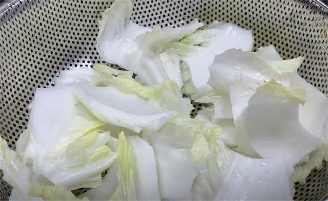 5.白菜幫我們也用手給它撕成不規則的小塊,這樣燉出來的白菜更軟爛,也更容易入味,把處理好的白菜幫放在漏籃里面備用。