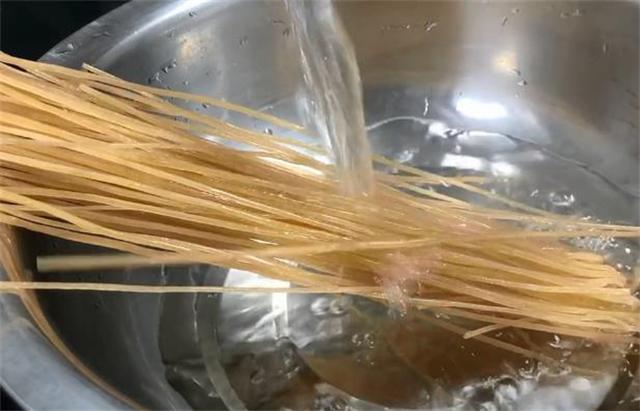 2.接下來準備一小把的紅薯粉條,放入盆中,加入溫水把粉條泡發。