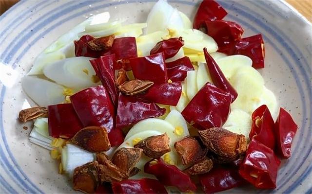 6.接下來準備幾瓣的大蒜,改刀切成片,生姜一小塊切片,一小節的大蔥斜刀切片,蔥姜蒜切好后裝在盤子里面,再準備幾個干辣椒,用剪刀剪成小段,不喜歡吃辣的也可以不用放,準備兩個八角,用手掰成小半,小料準備好了以后,先放一旁備用。