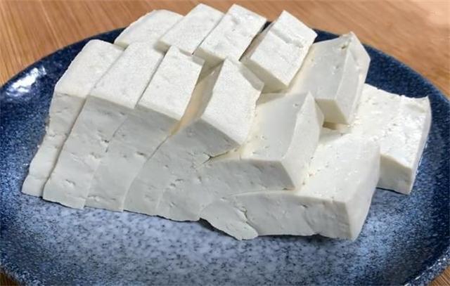 3.再準備一塊老豆腐,從中間切開,然后把豆腐改刀切成厚一點的片,切好后裝在盤子里備用。