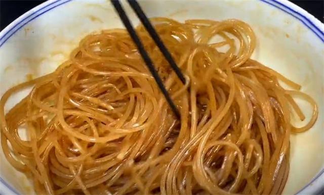 7.粉條泡好后裝入一個大碗中,往里面倒入少許的老抽,再倒入一點小磨香油,用筷子攪拌均勻,使粉條均勻的上色,這樣粉條看起來更加的有食欲,攪勻后先把它放一旁備用。