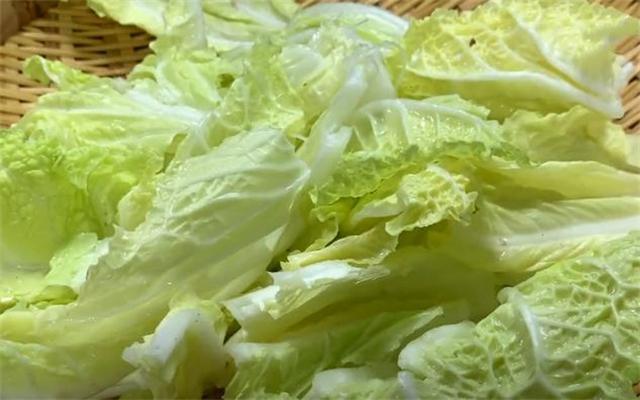 4.白菜控干水分后,直接用手把白菜葉子撕成小塊,燉的白菜我們最好用手撕,因為撕出來的白菜比用刀切出來的好吃,白菜葉子撕好后裝在漏籃里面備用。