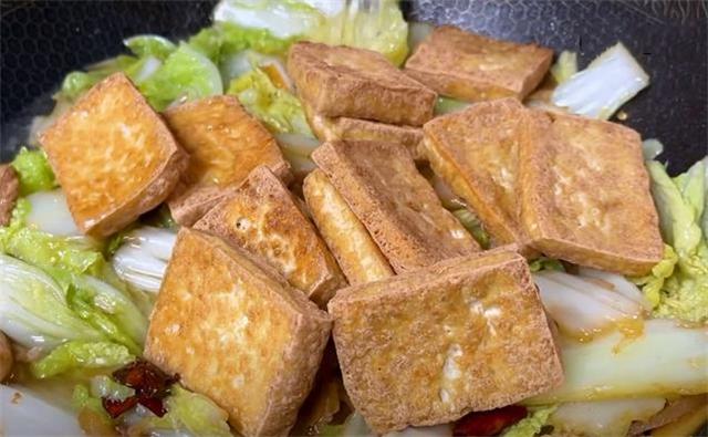 9.下面把鍋燒熱,把剛才煎豆腐的油放入鍋中,油熱后把蔥姜蒜、干辣椒、八角放進來,炒出它們的香味,炒香后,沿鍋邊淋入少許的料酒,再加入少許的生抽,繼續翻炒均勻。炒勻后先把白菜幫放進來翻炒,把白菜幫給它炒至斷生。白菜幫比白菜葉子熟起來更慢,所以我們要先把白菜幫煸炒一下,這樣成熟度才能一致。白菜幫炒到微微變軟后,再把白菜葉子放進來,繼續翻炒均勻,咱們把白菜葉子也給它炒軟,炒軟后下入豆腐。