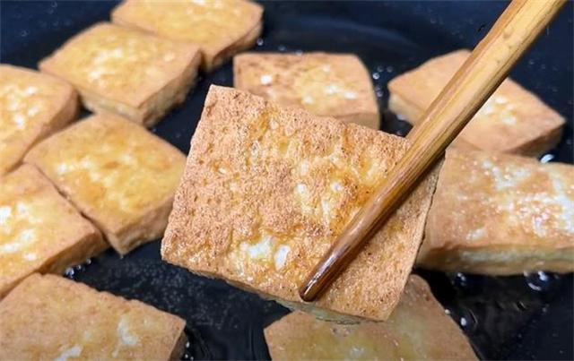 8.接下來平底鍋放上少許的油,咱們把豆腐給它煎一下,這樣吃起來更香,一面煎至金黃后,再翻一面過來,把兩面都煎至金黃,豆腐兩面都煎至金黃后,先夾出來放在盤子里面備用。(www.wS46.com)