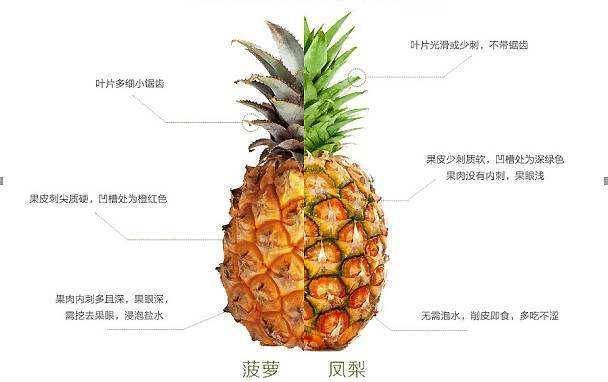 鳳梨和菠蘿實(shí)則上就是一種水果中的不同品種,就像我們的蘋果有紅富士,糖心,青蘋果等,菠蘿和鳳梨也就是品種不一樣而已。其兩種最大的區(qū)別就是其冠芽邊緣有沒有刺,我們常說的菠蘿,冠芽邊緣就是有刺的,而鳳梨的冠芽邊緣沒有突出的刺。果眼的深淺也有一定區(qū)別,菠蘿果眼較深,而鳳梨果眼很淺,甚至可以忽略的說沒有果眼。人們吃菠蘿之前常常會(huì)用鹽水泡半個(gè)小時(shí)再吃,而鳳梨則不需要,可以直接食用,并且口感還不會(huì)覺得澀,這是因?yàn)樗鼈儺?dāng)中含有的蛋白酶含量不一樣。這些區(qū)別就形成了人們對(duì)它們兩者的不同叫法,也就出現(xiàn)了人們對(duì)它們品種的質(zhì)疑。