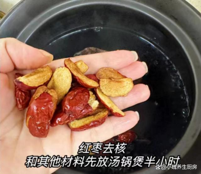 第五步:準備好一個砂鍋,鍋中放入紅棗,陳皮,切好的瘦肉塊,黑豆,山藥塊,加上足量的清水,改大火煲30分鐘,讓瘦肉煮至軟爛。