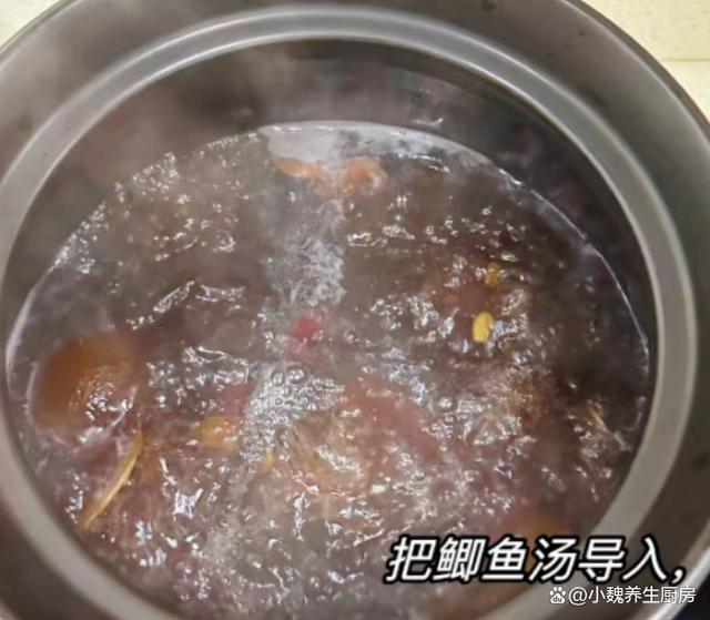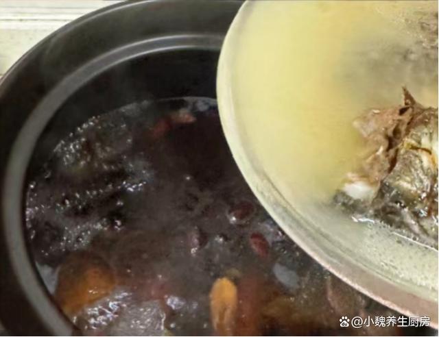 第六步:然后放入鯽魚一起煮,然后小火慢燉15分鐘左右,讓食材的營養都煮出來,加上適量食鹽,半勺白胡椒粉,燜煮一小會兒,出鍋,這款黑豆山藥鯽魚湯就制作完成了。