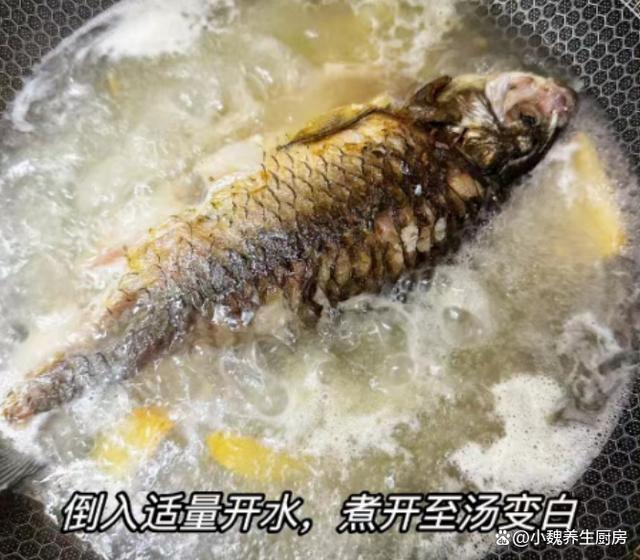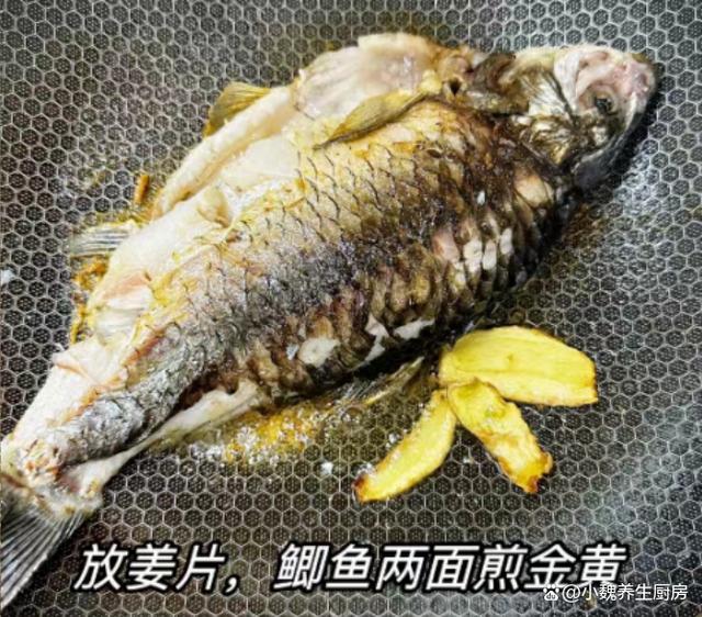 第四步:鍋底調入少許食用油,撒上少許食鹽,下入一條鯽魚,將鯽魚煎至色澤均衡,加上一些姜片,加上適量開始再次煮沸,讓湯汁再次煮沸。