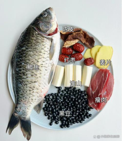 食材清單:選購50克優質黑豆,選購精瘦肉200克(建議選擇梅花肉或里脊肉,肉質要挑選最新鮮的,適合用來煲湯),挑選一根新鮮淮山藥,新鮮鯽魚一條(鯽魚是湖北人愛吃的魚之一,鯽魚肉質肥美,營養價值出色,鯽魚可以用來紅燒,用它來燉湯也很不錯,夏季可以多給家人喝鯽魚湯),幾個大紅棗,生姜一大塊,少許植物油,陳皮10克,純凈水若干,清水少許,食鹽和胡椒粉若干,其他調味品。