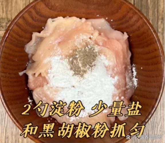 步驟3:將雞胸肉片放在容器中,加上兩勺紅薯淀粉,加上半勺料酒,加上食鹽和胡椒粉若干,滴入輔食油,用手快速抓拌一下,讓雞胸肉片腌制入味。