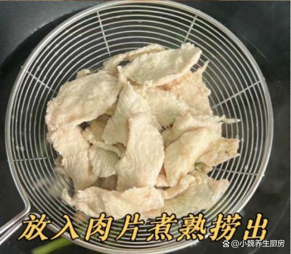 步驟4:鍋中加上冷水適量,放入蔥段和姜片,下入腌制好的肉片,讓雞胸肉燙熟,撈出用溫水沖洗干凈。 步驟5:鍋中加上植物油,加上姜末和蝦皮煸炒,加上適量清水煮沸,下入一些肉片和紫菜,煮3到5分鐘左右。