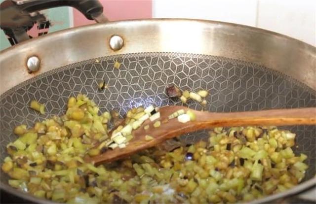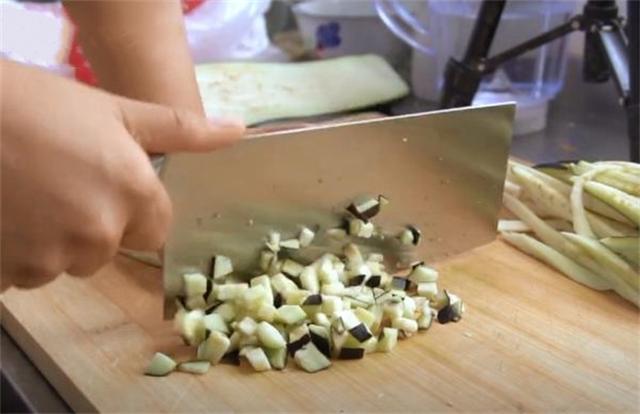 2.現(xiàn)在我們做一個(gè)尖椒茄子的餡,尖椒切成丁,同樣的一整個(gè)茄子也切成丁。