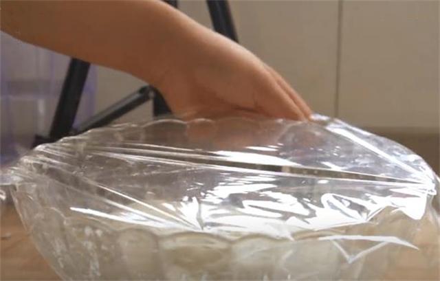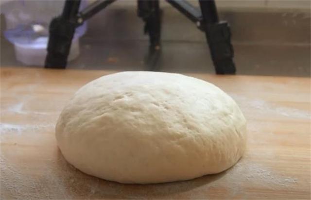 4.現(xiàn)在面團(tuán)也餳發(fā)好了,案板上撒點(diǎn)干粉,餳發(fā)好的面團(tuán)揉搓均勻,排出里面的空氣,蓋上保鮮膜再次醒發(fā)15分鐘。