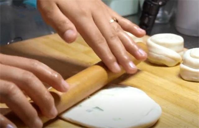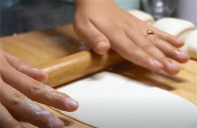 7.把餅胚再次按壓成圓餅,用搟面杖搟成薄皮。