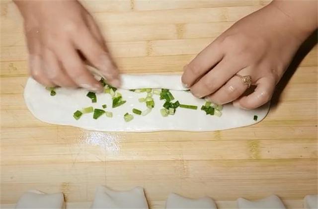 5.取一勺蔥花均勻的涂抹在上面,先橫著卷起來。