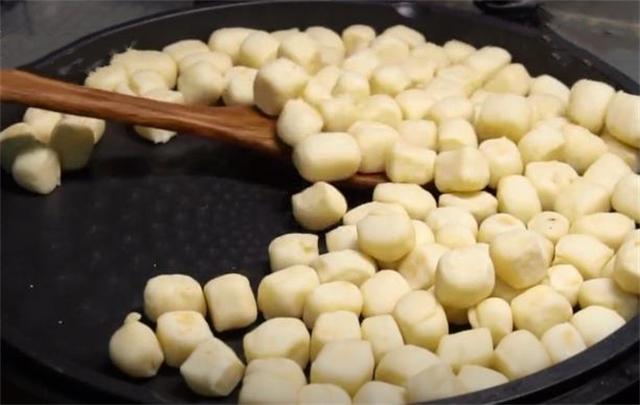 5.電餅鐺開小檔,不用刷油,直接下入小劑子,底面定型后,用鏟子勤翻動幾下。