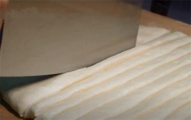 3.刀兩面刷油,把餅胚切成寬度均勻的長條。