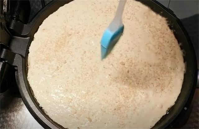 2.電餅鐺預熱刷油,倒入餳發好的面糊,撒入適量白芝麻,表面淋上少許油,蓋上蓋子燜上大約2分鐘。