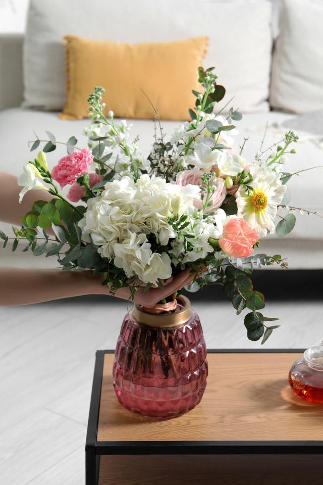 接著,放置于適當的環境。鮮花需要適當的環境條件才能保持良好的狀態。首先,避免將花瓶放置在陽光直射的地方,因為高溫和強光會使花朵迅速凋謝。其次,避免將花瓶放置在通風不良的地方,因為缺乏新鮮空氣會加速花朵的衰老。最后,確保將花瓶放置在室溫穩定的地方,避免溫度的劇烈變化。 此外,注意保持適當的濕度。花朵需要適度的濕度來保持新鮮。可以通過向花朵周圍噴灑適量的水來增加環境濕度,或者將濕毛巾或濕海綿放置在花瓶旁邊,增加周圍的濕度。但切記不要直接將水噴灑到花朵上,以免導致花瓣變軟或腐爛。