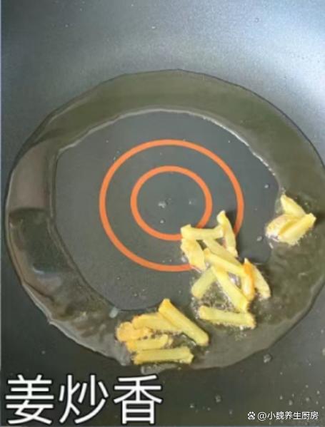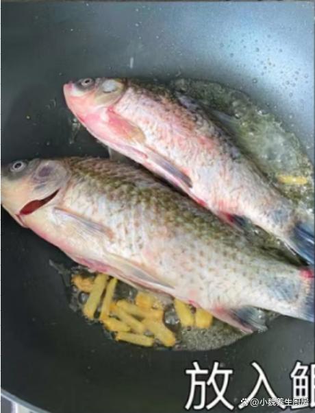 4:鍋底繼續(xù)留少許油,加上一些豬油融化開,放入一些姜絲和蔥花,用鍋鏟煸炒幾下,下入兩條鯽魚,兩面都煎至金黃,加上適量開水,讓湯汁煮至奶白色。