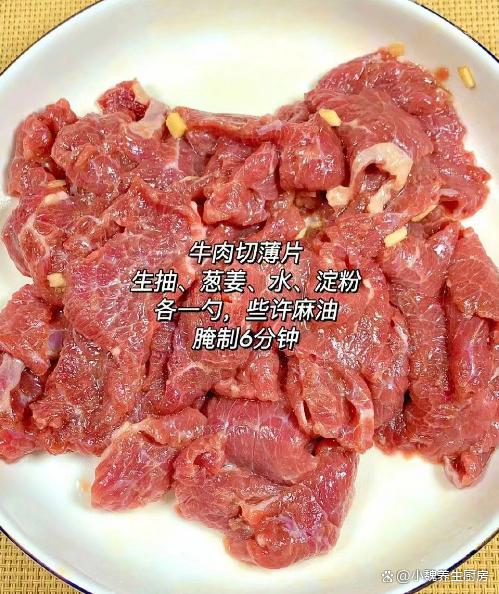 第四步:牛肉提前用食鹽和胡椒粉腌制,加上一些生粉或淀粉,加上半勺蔥姜水,加上原味醬油少許,快速抓拌一會(huì)兒,提前腌制入味。