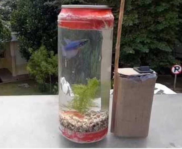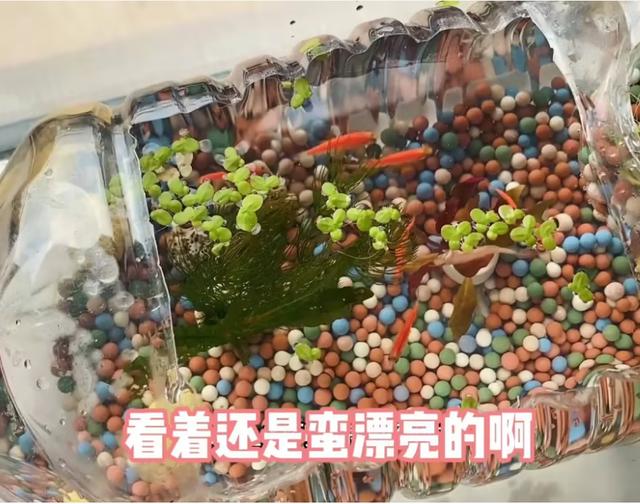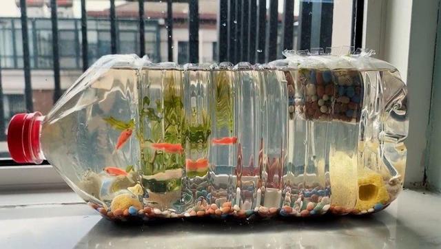 往大瓶里裝些能夠培養(yǎng)硝化菌的火山巖石,往瓶里裝些自然而美麗的流砂,往瓶里裝些水草, 然后再裝上幾株可以進行水培的綠植。 用大瓶裝水,如果第一次裝的水不太清,那就開瓶,讓它看起來更清一些,第二次裝水,等三天后,才能把魚放生。 因為大容量的礦泉水瓶都是圓的,方便來回晃動,因此,只需在礦泉水瓶的兩邊用膠水粘上兩根竹條,就可以將礦泉水瓶固定起來,形成一個免費的魚缸。