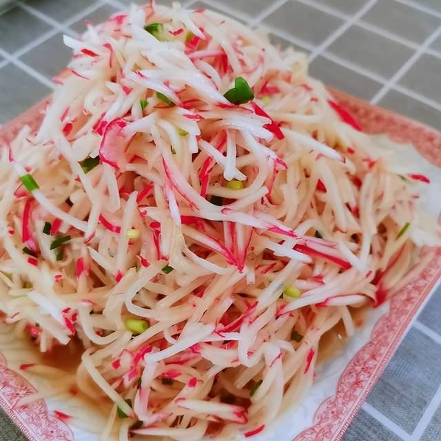 用料: 新鮮水蘿卜1根,蒜3瓣,紅油辣椒醬適量,生抽適量,糖適量,醋適量,香菜適量 做法: 1. 水蘿卜洗凈,去皮切絲,放入盆中,加入一小勺鹽,攪拌均勻,腌制10分鐘。 2. 蒜瓣剁成蒜蓉,香菜洗凈切好備用。 3. 水蘿卜腌制好后會出水,把水蘿卜撈出,用清水沖洗一遍,將水蘿卜的鹽分沖掉,然后用手稍稍擰干水分。 4. 在水蘿卜絲上加入蒜蓉,紅油辣椒醬,生抽,糖,醋,攪拌均勻。 5. 最后撒上切好的香菜即可。 小妙招: 1. 水蘿卜在切絲后加鹽腌制,可以讓水蘿卜變得更脆,口感更好。 2. 紅油辣椒醬可以根據自己的口味調整,不喜歡辣的可以減少或者不放。 3. 這道菜可以根據自己的口味,加入一些芝麻油或者花生油增加香氣。 涼拌萵筍絲