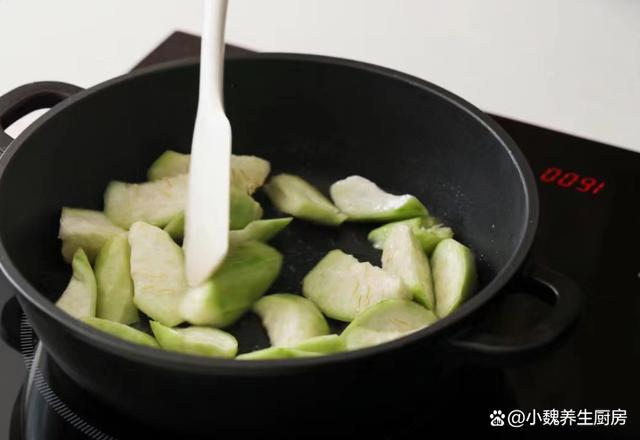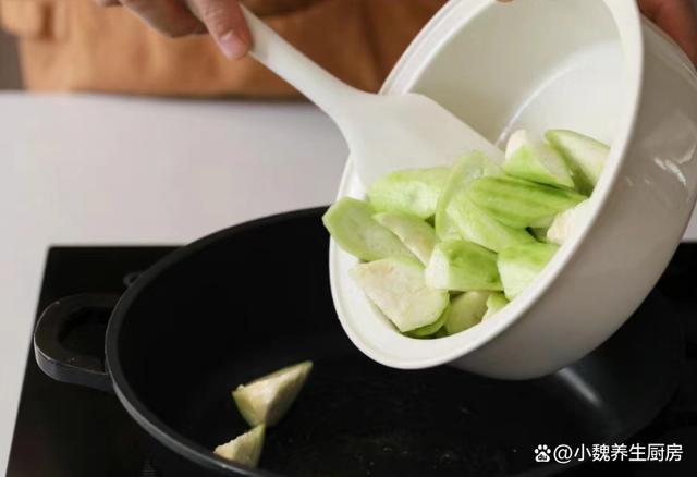 第四步:鍋底提前燒熱預(yù)熱,加上少許豬油融化開,加上蔥白和蒜末炒香,倒入絲瓜炒出水分。