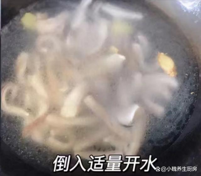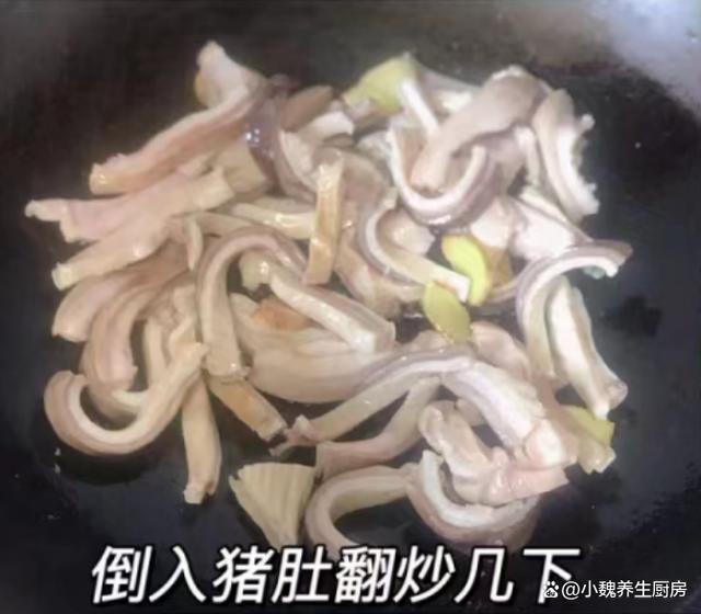 5:鍋中慢慢燒熱,加上食用油少許,放入一些姜片煸炒一會兒,倒入焯水好的豬肚,迅速翻炒一會兒,加上適量清水煮開。