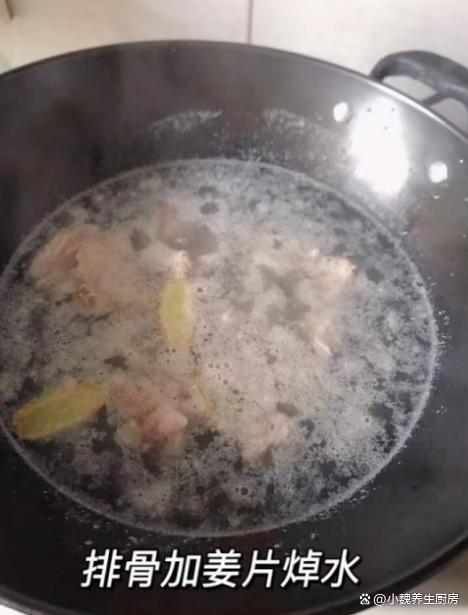 第三步:提前把豬骨提前剁成塊,豬骨用流水反復(fù)沖洗干凈,用鹽水浸泡半個(gè)小時(shí),準(zhǔn)備好一些豬骨,蓮藕和其他食材,開始制作這道雪梨蓮藕紅棗燉豬骨湯。 第四步:提前準(zhǔn)備好一個(gè)燉鍋,鍋中放入洗凈的豬骨,加上適量冷水沒過食材,丟入姜片和蔥段,加上一丟丟料酒去腥,大火煮幾分鐘,撇去一些浮沫,溫水反復(fù)沖洗,控干水分備用。
