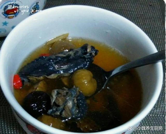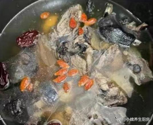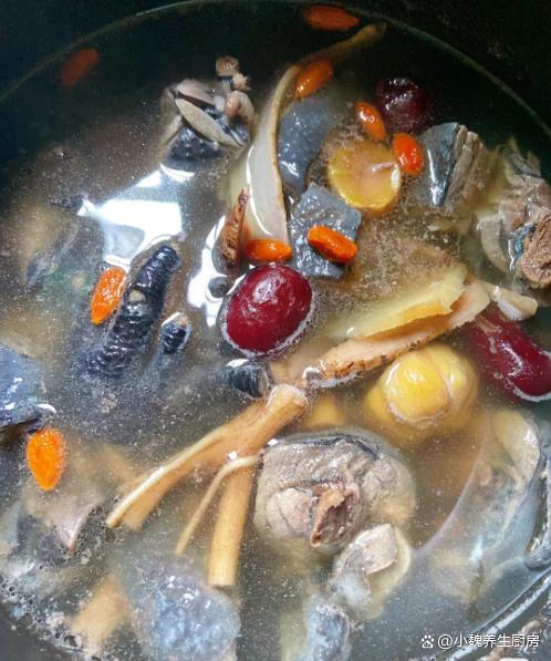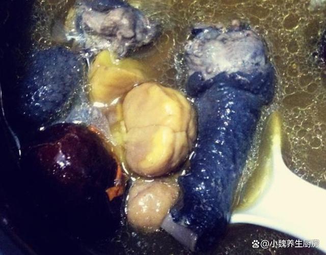第六步:等待烏雞燉一個小時,放入一些枸杞子,出鍋前加上食鹽,胡椒粉和其他佐料,燜煮幾分鐘,盛出,這款板栗黃芪烏雞湯就制作完成了。