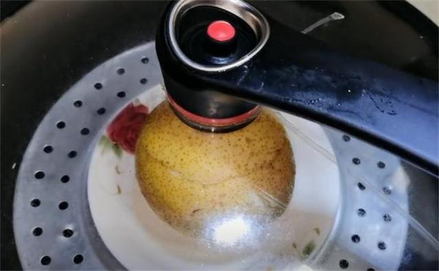 4.鍋里面水開,我們放到鍋里面蒸,蒸的時候把梨子的蓋子給它蓋上,然后蓋上蓋子,大火蒸20分鐘。