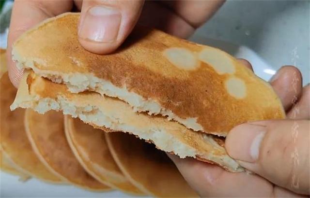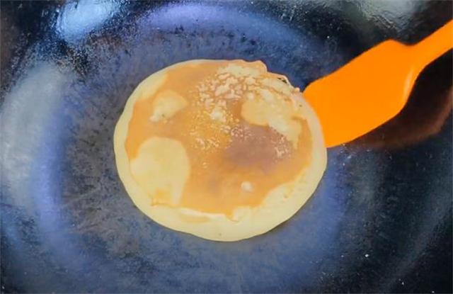 3.最好找個不粘鍋不用刷油,如果是普通鐵鍋,第一張餅刷點油,然后再用廚房紙擦干凈,將鍋燒至微熱,下鍋前先把面糊攪拌幾下,一勺面糊剛好烙一個餅,將面糊倒入鍋中,小餅會自動成圓,用小火烙至一分多鐘,底部定型給它翻個面,再烙半分鐘,兩面烙至金黃即可出鍋。