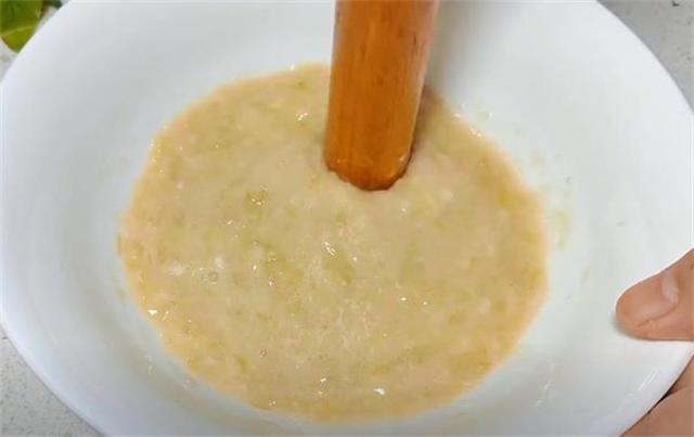 1.準備香蕉一根,用搟面杖搗成泥,搗得越細越好。
