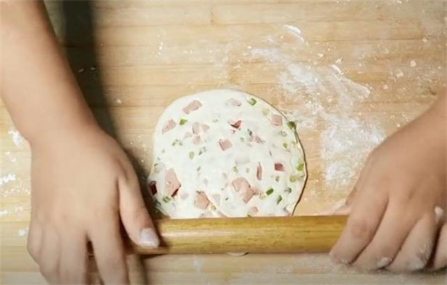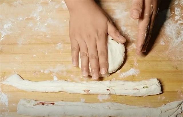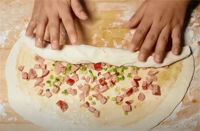 6.涂抹一層油酥,撒上蔥花,紅腸丁,由底部從外向里卷起來。