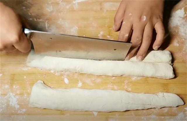 5.面餳好了,案板上多撒一些面粉,分成兩個劑子,取其中一個劑子整理形狀搟成餅皮。
