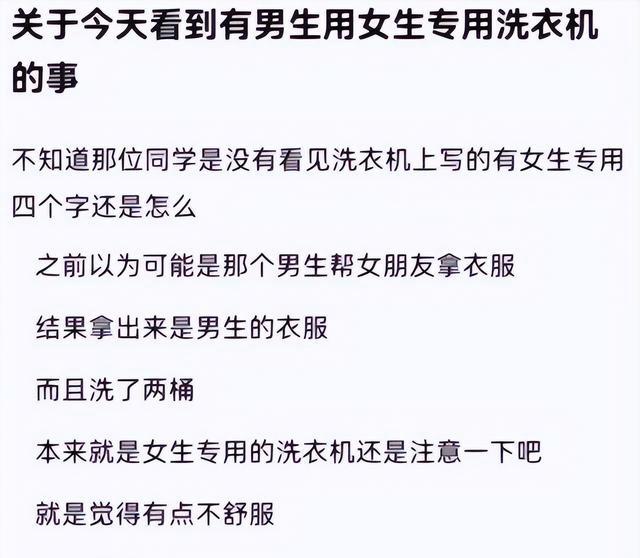 最近,有一所大學在網絡上引起了很大的討論。 原來學校里已經建立了一套男女分開的洗衣機,不過還是有很多男同學偷用女同學的洗衣機。
